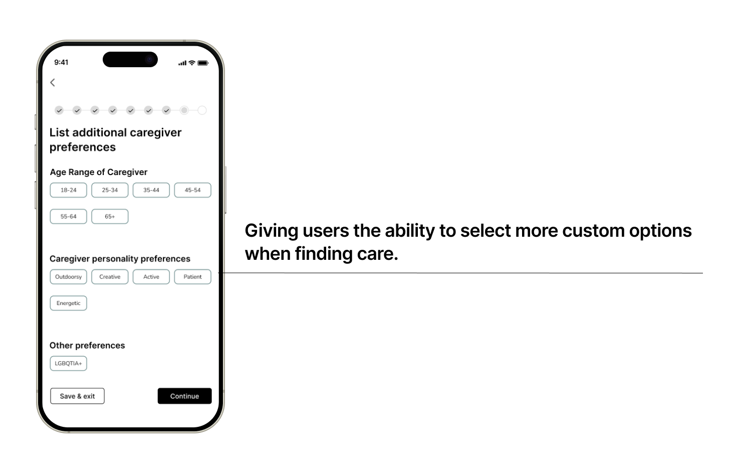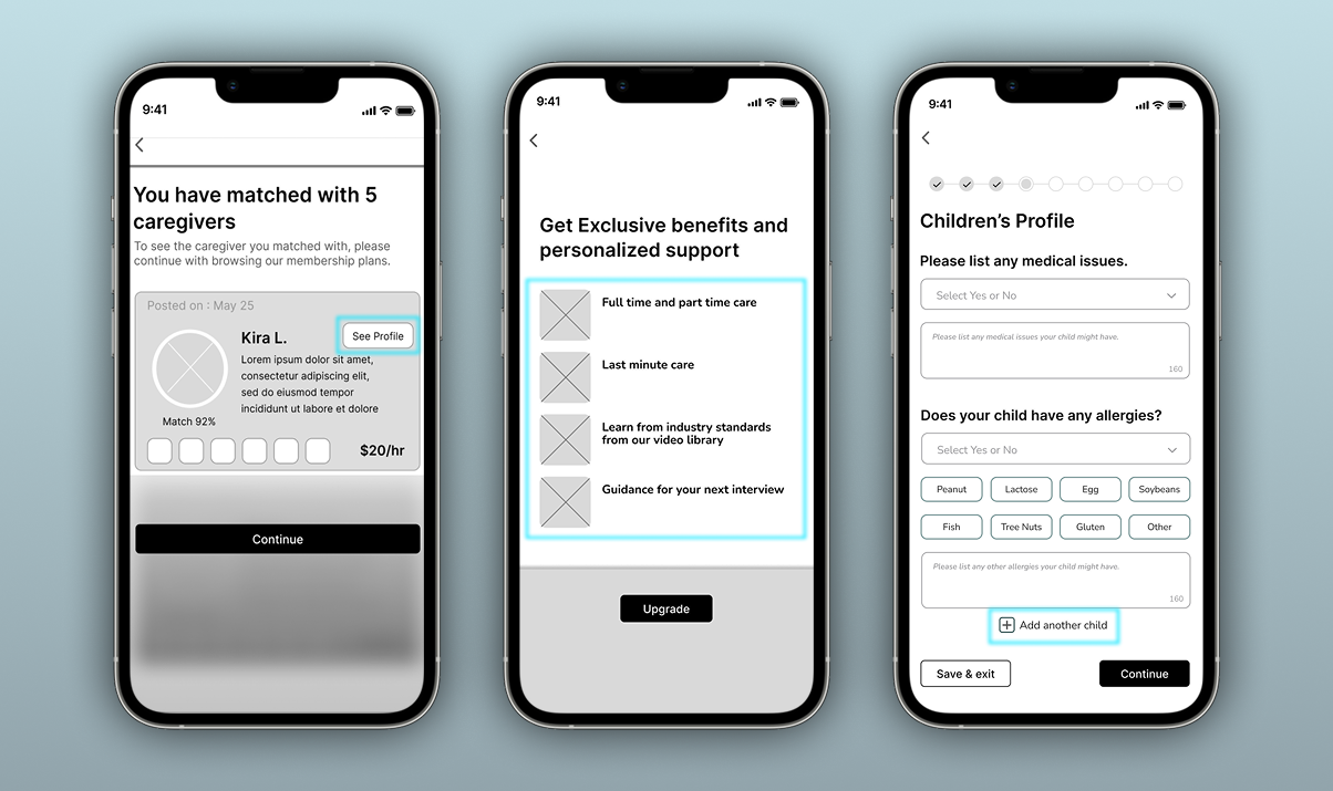The solution to what we had learned after the interviews, was to create an option for parents to select “LGBTQ” under “Other Preferences.” The selection is optional but can help users feel more secure and confident when finding new caretakers.